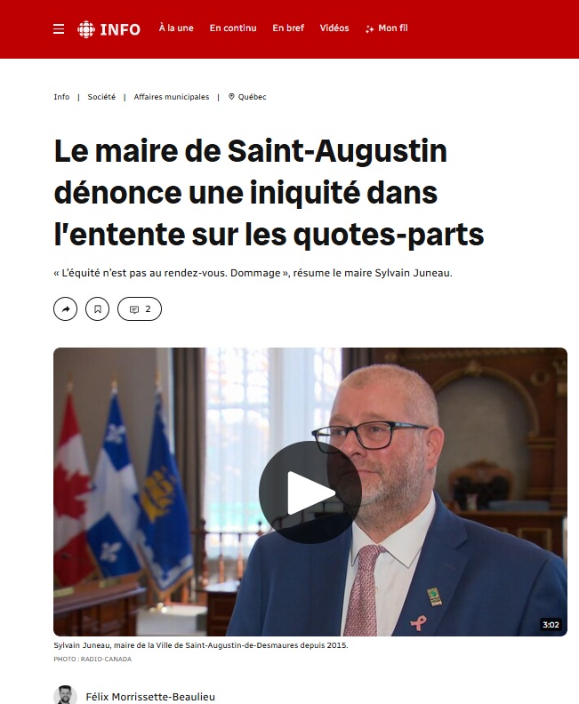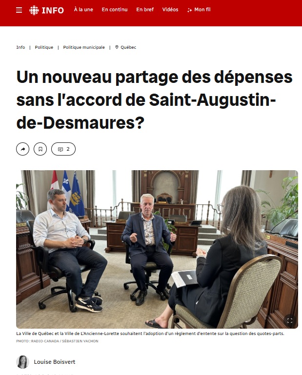 • Juin 2025. Après plus de deux ans de négociations, la Ville de Québec et de L’Ancienne-Lorette s’entendent sur un nouveau partage des quotes-parts. Elles souhaitent un règlement avant les élections municipales. Même si elle a toujours été informée du déroulement des négociations, la Municipalité de Saint-Augustin-de-Desmaures est demeurée silencieuse depuis ce nouvel accord.
