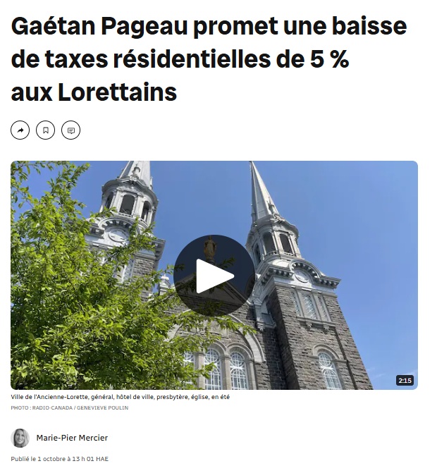 « À L’Ancienne-Lorette, le maire sortant, Gaétan Pageau, mise sur une baisse de taxes, sur sa gestion des finances publiques et sur la vitalité de sa municipalité pour obtenir un 3e mandat à l’Hôtel de Ville. Il fait face au candidat Alain Fortin qui veut remettre l’argent de l’entente sur le partage des quotes-parts avec la Ville de Québec dans les poches des citoyens. »
